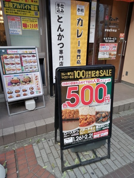松のやのお年玉企画、新春ワンコインセールは終わってしまいましたが、マイカリー食堂で新しいワンコインキャンペーンがスタートしました\(^o^)/イセザキモール店は松のやとマイカリー食堂が併設されておりますので、恩恵が連続して受けられるのです!ラッキーです、今回は100店舗達成記念SALEと題されてます。行けばクーポンも貰えて更にお得な特典ももらえますよ(伊勢佐木店だけならスミマセン<(_ _)>)